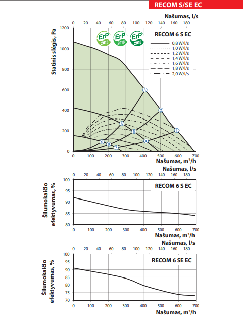 Pagrindinės Recom 6S vėdinimo įrenginio charakteristikos: