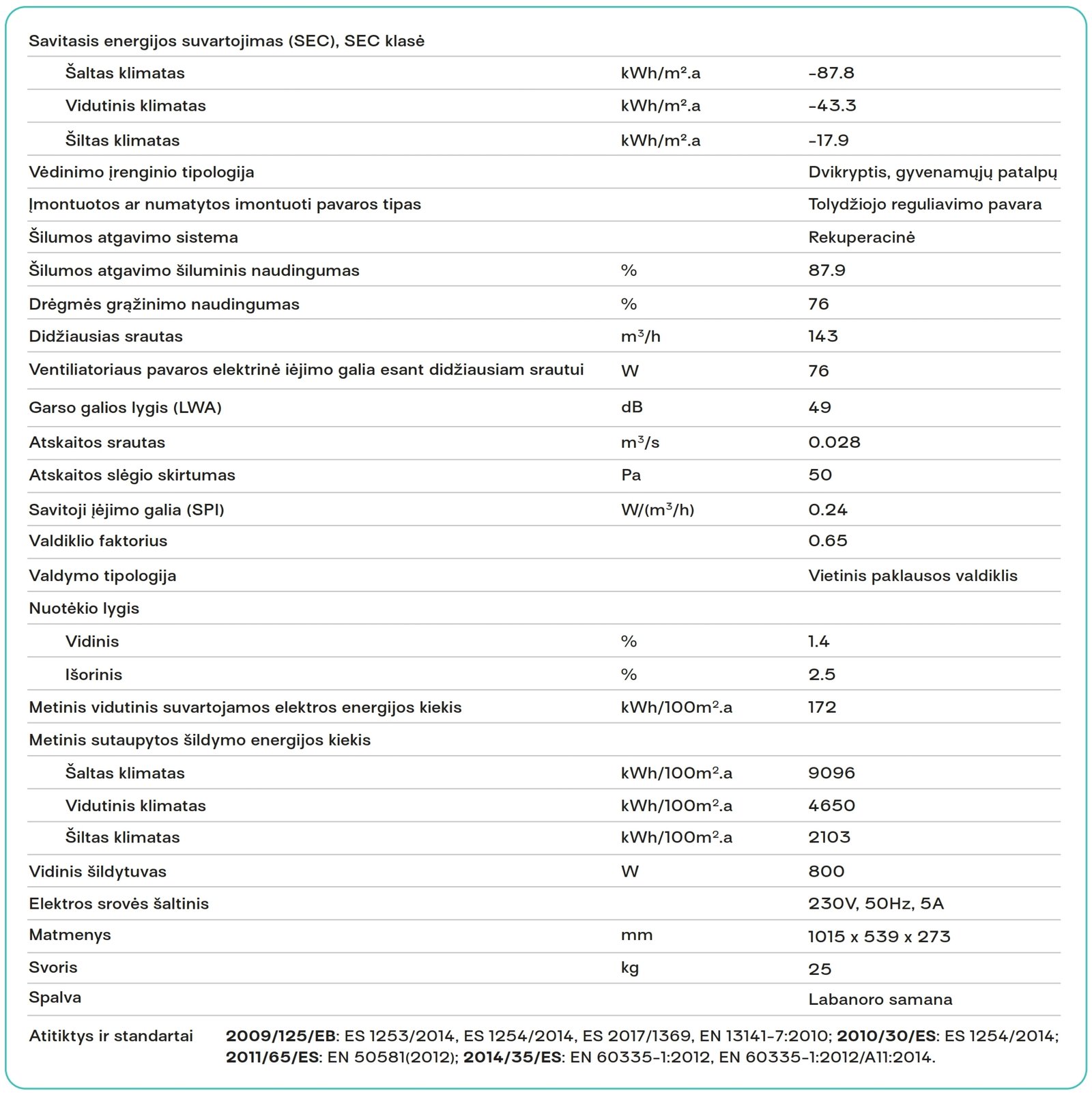 - Šilumogrąžos naudingumas – 87.9%