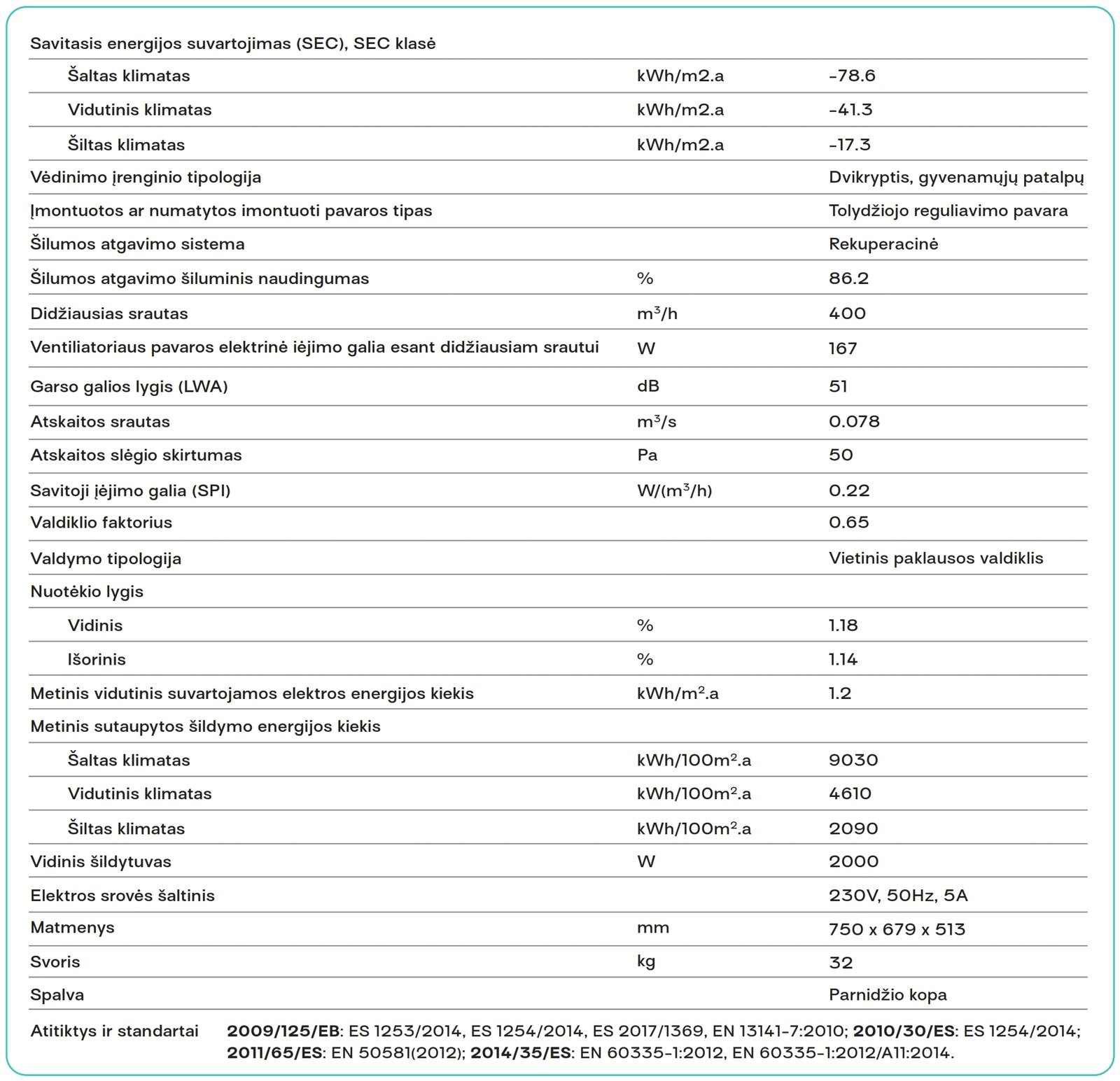 - Šilumogrąžos naudingumas – 86.2%