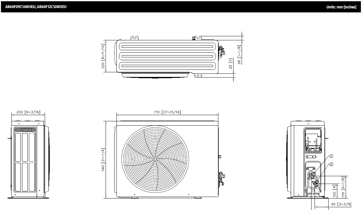 | Išorinio bloko gabaritai (plotis / aukštis / gylis), mm | 710x540x220 | |